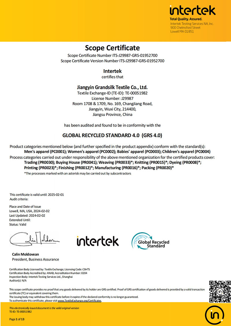 | JiangYin GrandSilk Textile Co., Ltd is a company with own manufactory in more than 20 years' experience in garment, apparel, and accessory exportation. Our production is both woven and knitting item, all our production are covered the Oekotex, BCI, GRS, OCS,GOTS,CMIA certification.